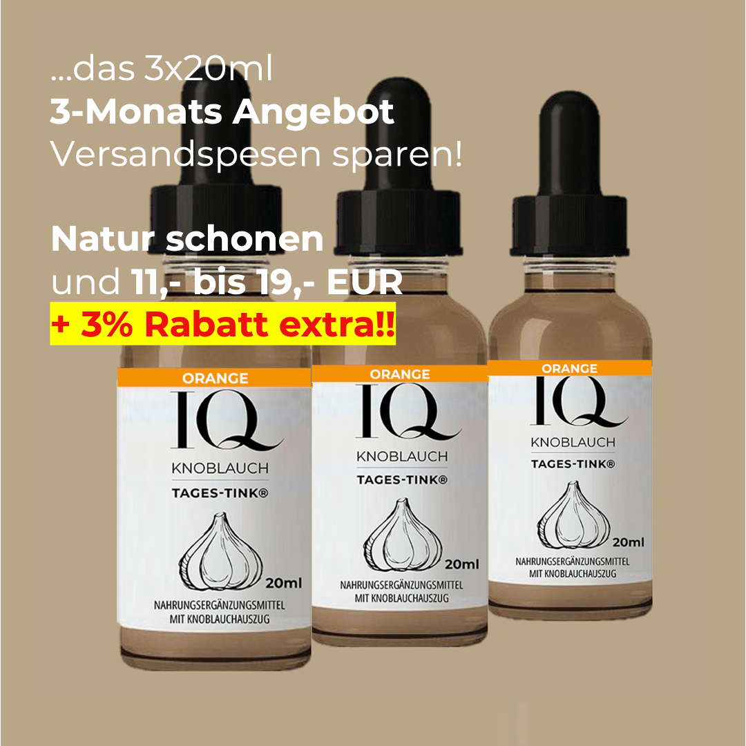 Der IQ TAGES-TINK® ist das praktisch wasserlösliche Knoblauchöl mit einer außergewöhnlichen Absorptionsrate. Die Einnahme kann innerhalb von ein paar Tagen zu gefühlt mehr Lebensenergie im Alltag und einer verbesserten Denkleistung führen. Durch das eigens entwickelte Herstellungsverfahren entsteht, trotz Einnahme der Knoblauchkur, kein indirekter Körpergeruch. Das originale Rezept der Tibetischen-Knoblauch-Kur soll 2.000 bis 3.000 Jahre vor Christus von Mönchen in Tibet entwickelt und 1971 auf alten Tontafeln in Klosterruinen entdeckt worden sein und galt damals als eine Art Allheilmittel.